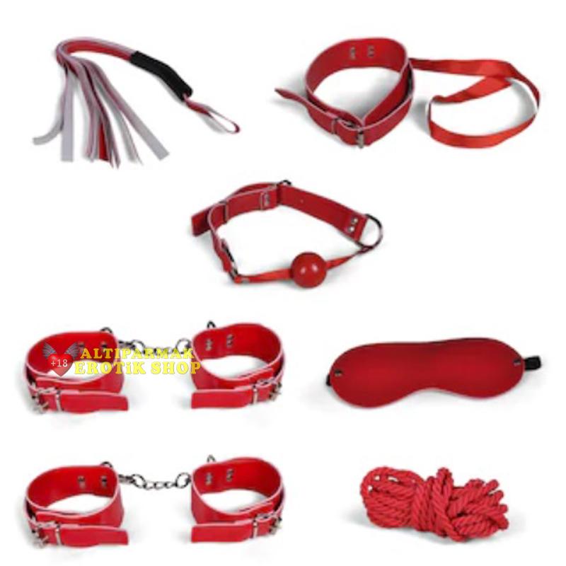 Fetish Fantezi 7 li Seri Kırmızı Set - Kırbaç - Peluşlu el Kelepçesi - Peluşlu ayak kelepçesi - Boyun tasması - Ağız topu - Göz bandı - Bağlama ipinden oluşan komple fetiş ürün setidir.